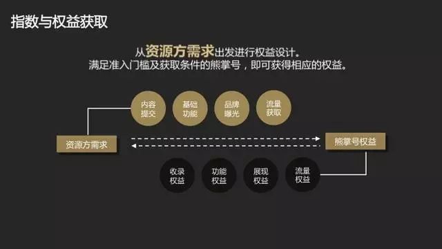 有了熊掌号指数之后就能获得相应的权益。权益的设计主要从资源方的需求出发,从内容提交、基础功能、品牌曝光和流量获取等几方面为资源方赋能。