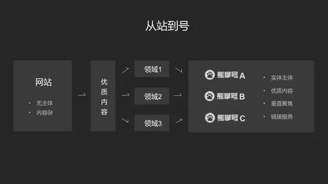 熊掌号出现后,百度搜索排序机制也开始发生迭代。在旧有的搜索排序机制中,资源是以网站为单位参与排序的,但在新机制下,一个网站可以开多个熊掌号,进行实体认证后,分别将优质的、垂直领域的内容提交到相应的熊掌号。比如一个体育类网站可以分别开通足球、篮球、排球等不同熊掌号,分别运营不同类别的熊掌号,链接相对精准的服务,获得更多收益。