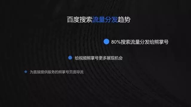 百度搜索流量分发趋势正在发生新的改变,简单来说分为3个方向:80%搜索流量将分发给熊掌号;搜索将逐步倾向于为直接提供服务的熊掌号页面导流,给视频熊掌号更多展示机会,最终实现80%的搜索流量分发给熊掌号。