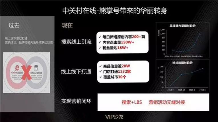 下面分享一个案例。中关村在线过去是是典型的内容站,也有部分电商,但没有用户沉淀,做得有点被动,线上跟线下是完全割裂的。通过熊掌号,他们发现了特色玩法:把线上的流量导到线下流量。比如用户在百度搜索戴尔电脑,可以直接跳转到服务页(售卖页),既给出了戴尔电脑的信息,也给出了实体店的信息,想要线下消费还有优惠,用户可以到线下体验。