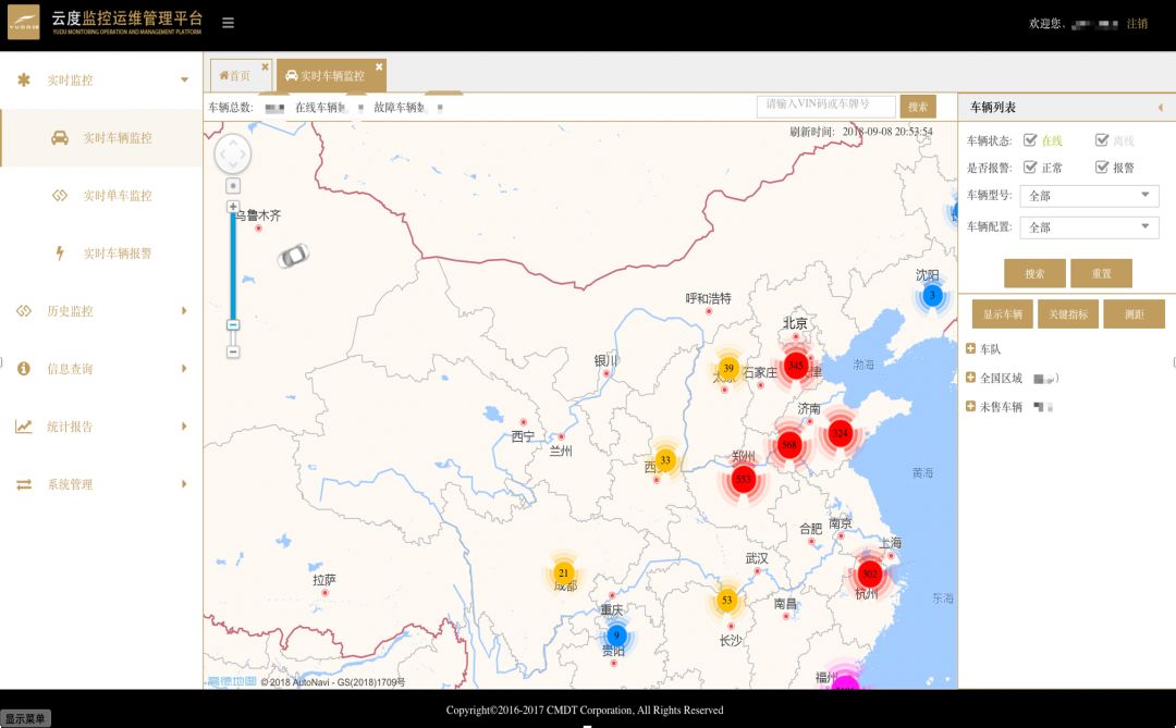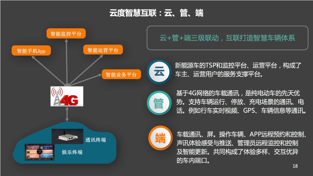 第一个是智能互联平台的架构,有三个核心的内容。一个是车联网平台的架构,第二是应用型的平台架构,第三个是远程控制平台。每辆车所装的关键零部件都做到了实时的跟踪,包括每台车的追溯、控制,车联网平台通过通讯模块与车辆进行交互。