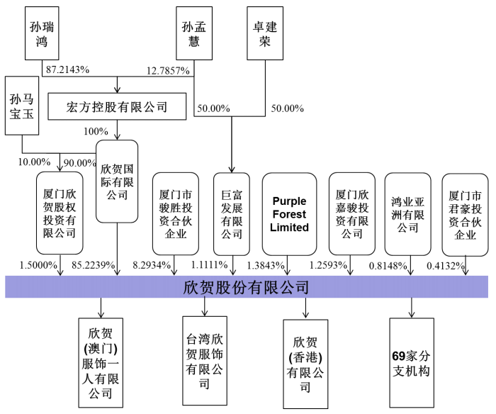 股东名单虽然星光熠熠,但公司的实际控制人仍然是孙氏家族,成员具体为孙瑞鸿、孙孟慧、卓建荣和孙马宝玉,其中孙马宝玉与孙瑞鸿、孙孟慧为母子(女)关系,孙孟慧与卓建荣系夫妻关系。孙氏家族成员通过欣贺国际、欣贺投资、巨富发展合计持有公司87.8350%的股份。