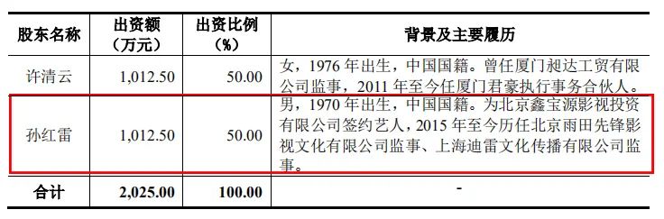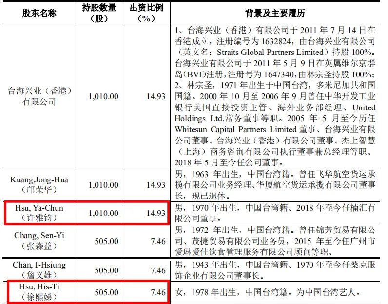 此外,根据招股说明书,Purple Forest Limited持有公司1.3843%的股权,厦门君豪投资持有公司0.4132%的股权。值得关注的是,小S夫妇为Purple Forest Limited股东,分别持股14.93%和7.46%,孙红雷为厦门君豪股东,持股50%,间接为欣贺股份股东。
