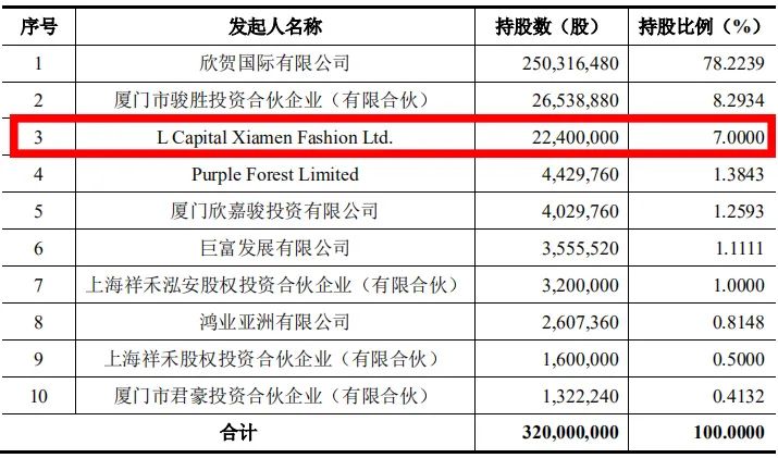 招股说明书显示,2011年年底,欣贺股份将7%的股份出让给法国奢侈品集团 LVMH旗下L Capital(L Catterton Asia 前身),每股转让的价格约为15.13元,涉资约3.38亿人民币。这是L Capital Asia首次投资亚洲的服装集团,也是其在国内进行的第一项投资。2018年1月,L capital将其持有公司的7%股权转让给欣贺国际。