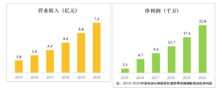 据公司财报数据显示,从2015年至2020年,公司营业收入从1.8亿元增长至7.3亿元,年复合增长率超过40%;而净利润从2.1千万增长至2.28亿元,涨幅超10倍。