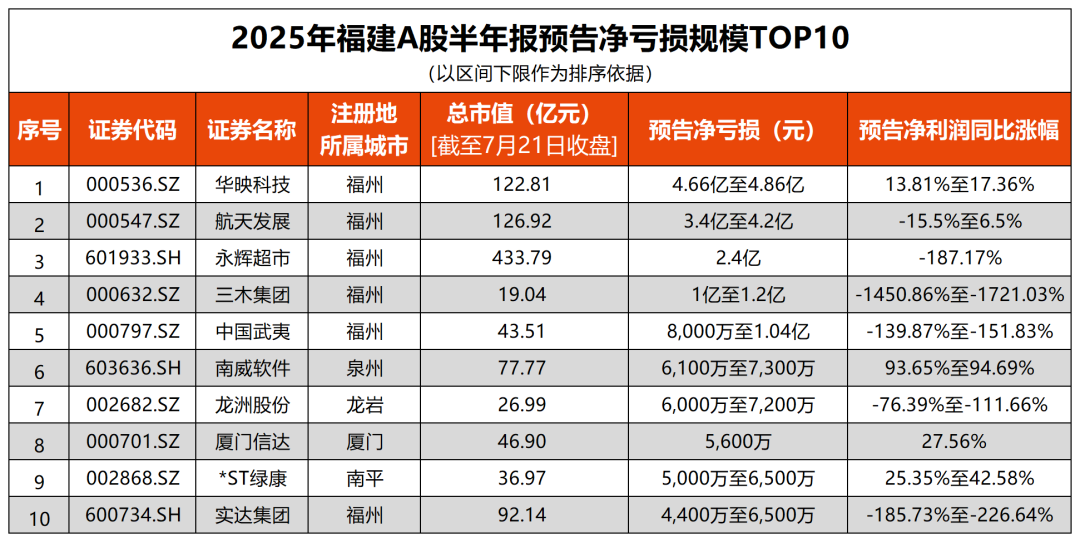 在2025年半年度福建A股预告净亏损规模TOP10榜单中,华映科技(000701.SZ)、航天发展(000663.SZ)、永辉超市(002110.SZ)亏损金额排名前三,分别为4.66亿元、3.4亿元、2.4亿元。
