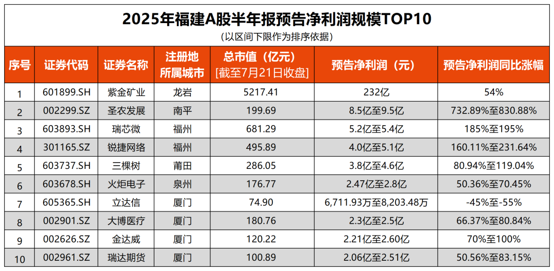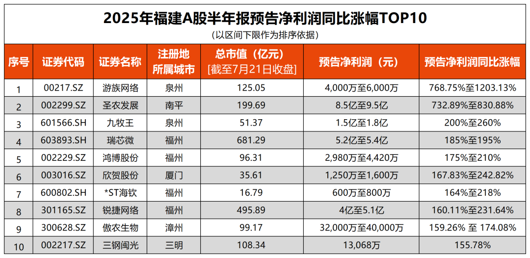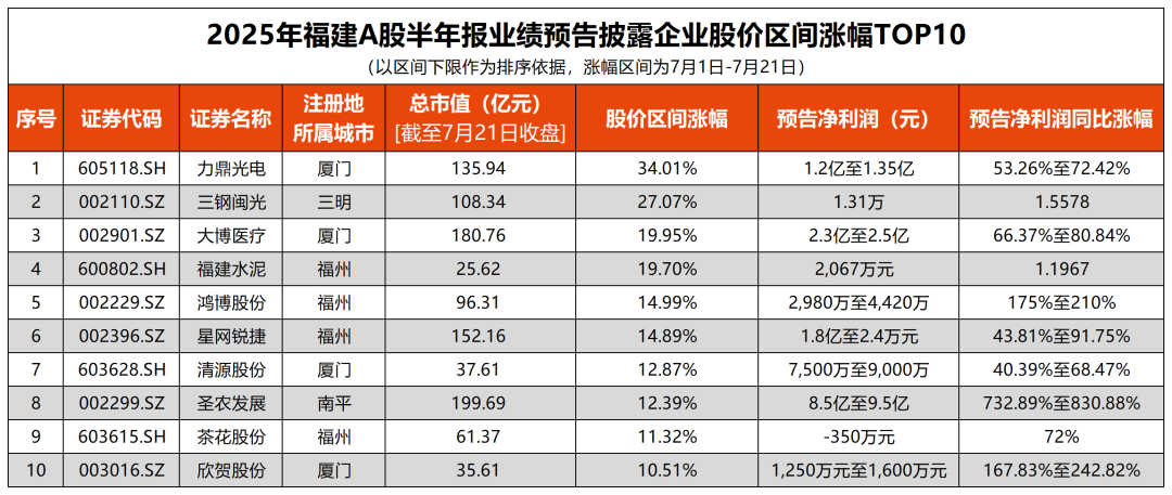 尽管多数绩优股股价随业绩同步上涨,但仍有部分企业出现 “业绩与股价背离” 的情况。【观澜财经】统计了披露业绩预告的福建A股企业中,自7月1日到7月21日股价区间涨幅前十的企业。