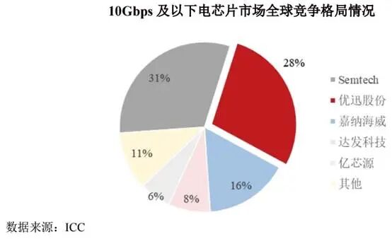 优迅股份表示,公司产品性能和技术指标上实现对国际头部电芯片公司同类产品的替代,成功打入全球众多知名客户供应链体系。根据ICC 数据,2024 年度优迅股份在10Gbps及以下速率产品细分领域市场占有率位居中国第一,世界第二。