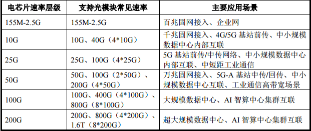 ▲不同速率的电芯片以及对应的常见应用场景 来源:招股书