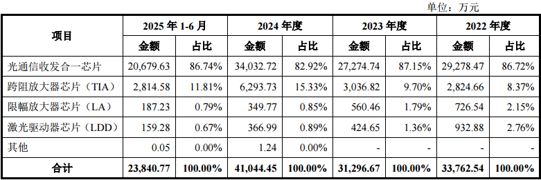 其中,光通信收发合一芯片的收入贡献最大,占比在各年度均超过80%。