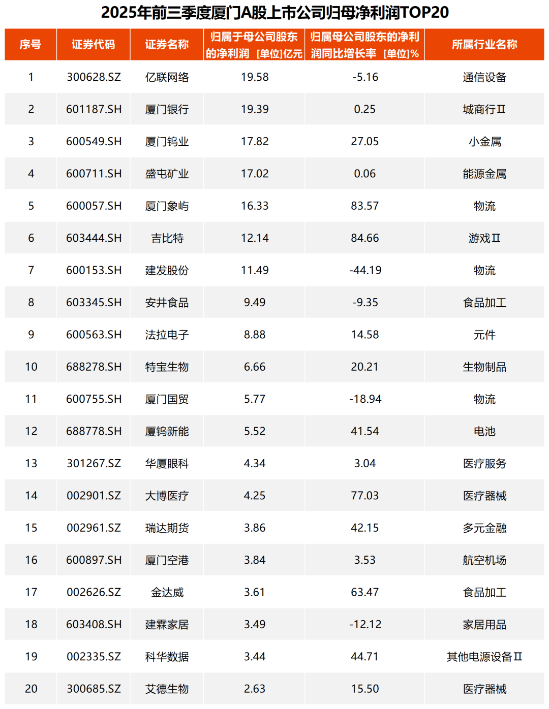 在归母净利润方面,亿联网络(300628.SZ)、厦门银行(601187.SH)、厦门钨业等7家企业归母净利润超10亿元。亿联网络成为厦门市前三季度最赚钱的A股上市企业,归属于母公司股东的净利润达19.58亿元。