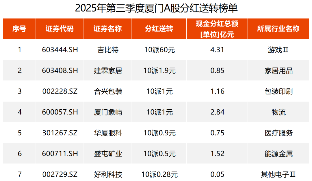 第三季度,厦门辖内共有7家A股上市公司宣告2025年三季度分红,现金分红总额共计为11.48亿元。其中,吉比特每股分红最慷慨,分红现金总额也是最多。