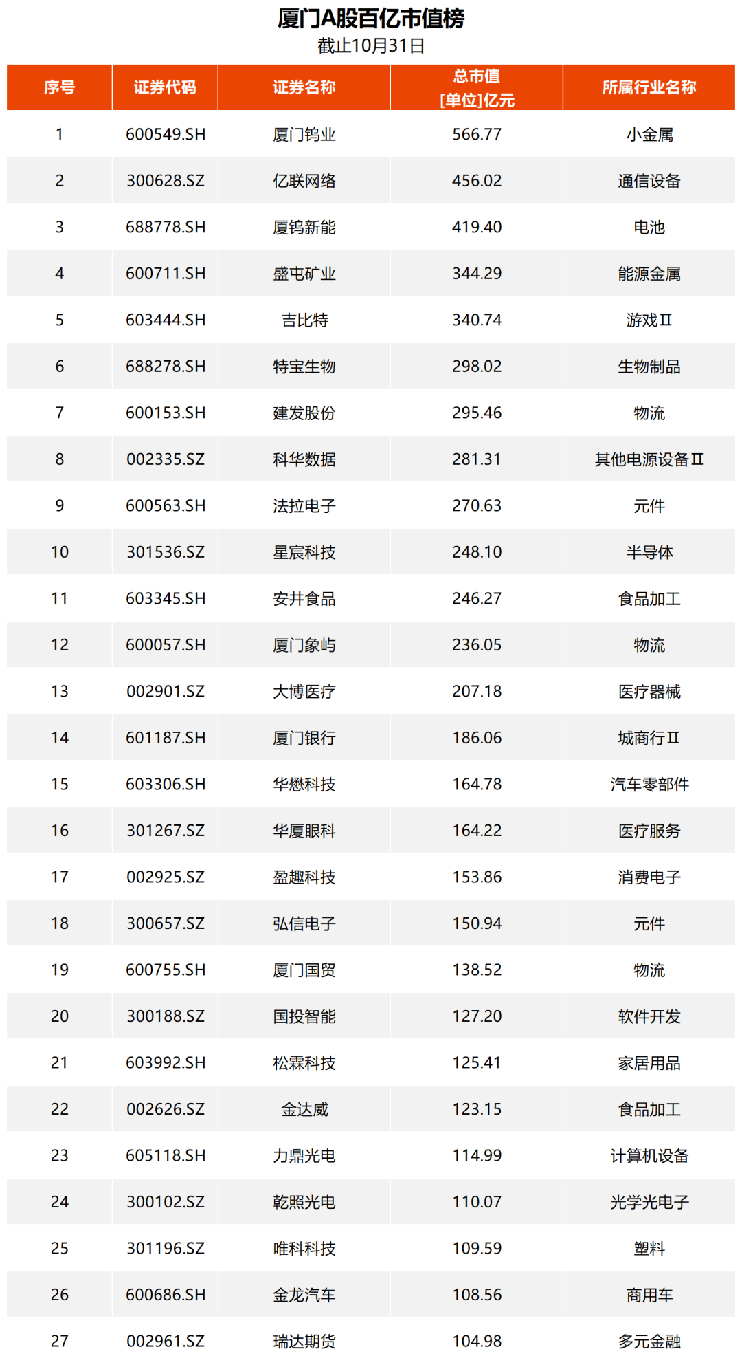 共有27家企业市值超100亿元,较去年同期增加6家,占辖区上市公司总数近四成,其中,厦门钨业超过亿联网络,以566.77亿元的总市值成为厦门A股市值最高的企业。亿联网络、厦钨新能分别以456.02亿元和419.40亿元的市值紧随其后。