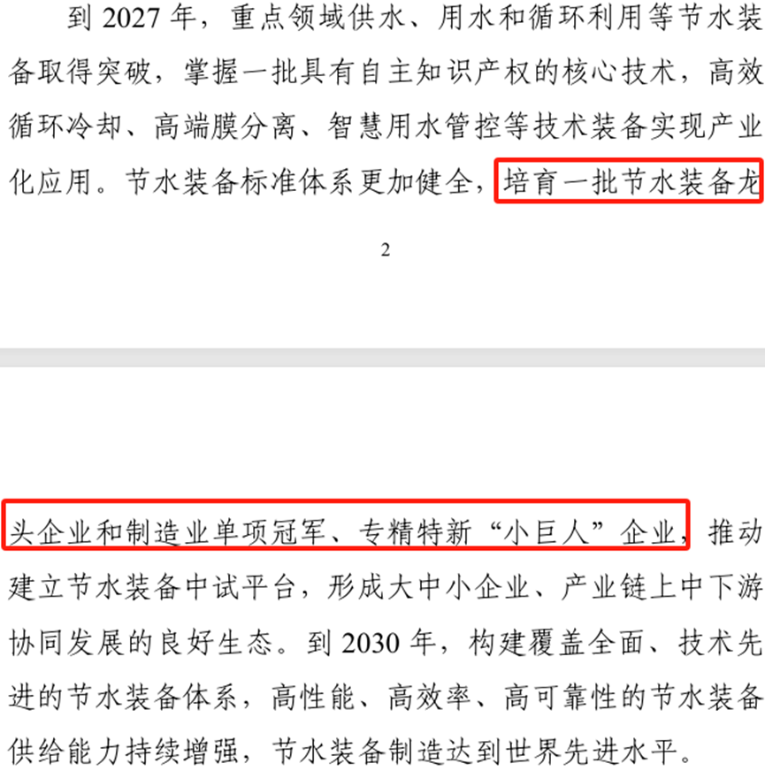 到2027年,在高效循环冷却、高端膜分离、智慧用水管控等关键技术装备方面实现产业化突破,培育一批节水装备龙头企业和制造业单项冠军、专精特新“小巨人”企业;