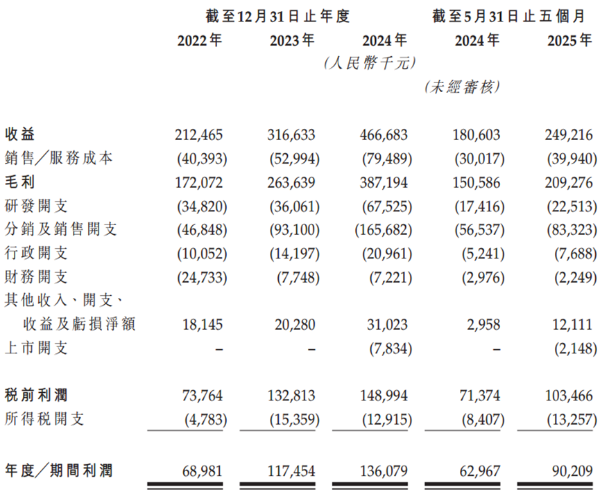 净利润方面,2022年、2023年及2024年以及截至2025年5月31日止五个月,分别为人民币0.69亿元、人民币1.17亿元、人民币1.36亿元及人民币0.90亿元。